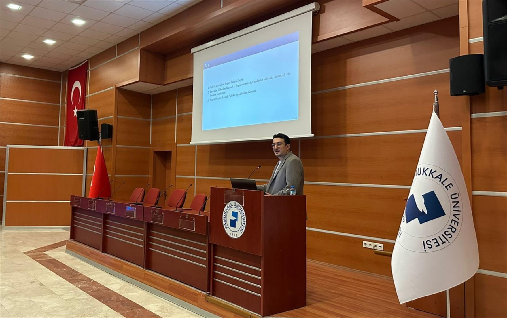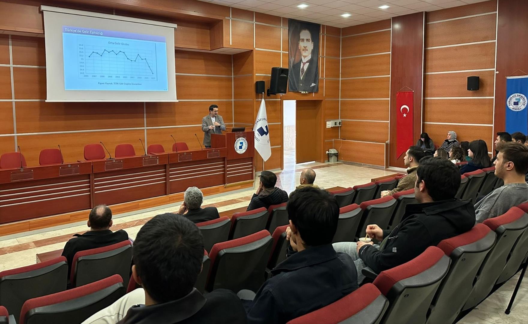 Pamukkale Üniversitesi (PAÜ) İktisadi ve İdari Bilimler Fakültesi (İİBF) tarafından düzenlenen “Gün Ortası Seminerleri” kapsamında, Uluslararası Ticaret ve Finansman Bölümü Öğretim Üyesi Doç. Dr. Uğur Akkoç, asgari ücretin gelir dağılımı ve enflasyonla ilişkisini akademik veriler ışığında değerlendirdi.
