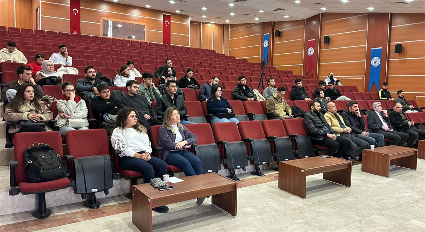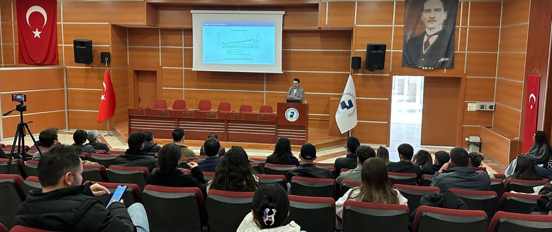Şehit Piyade Teğmen Bekir Can Kerek Konferans Salonu'nda 27 Kasım Perşembe günü gerçekleştirilen seminerde, asgari ücret politikalarının ekonomik yansımaları ele alındı. Seminerin konuşmacısı Doç. Dr. Uğur Akkoç, “Asgari Ücret İllüzyonu” başlıklı sunumuyla makroekonomik dengelere dair kapsamlı bir analiz sundu. Doç. Dr. Akkoç, sunumunun ilk bölümünde asgari ücret ile gelir dağılımı arasındaki ilişkiyi güncel grafikler eşliğinde detaylandırdı. Orta sınıfın para politikalarıyla olan etkileşimine dikkat çekilen sunumda, asgari ücret artışlarının genel ücret seviyeleri ve ortalama ücretler üzerindeki baskısı irdelendi.