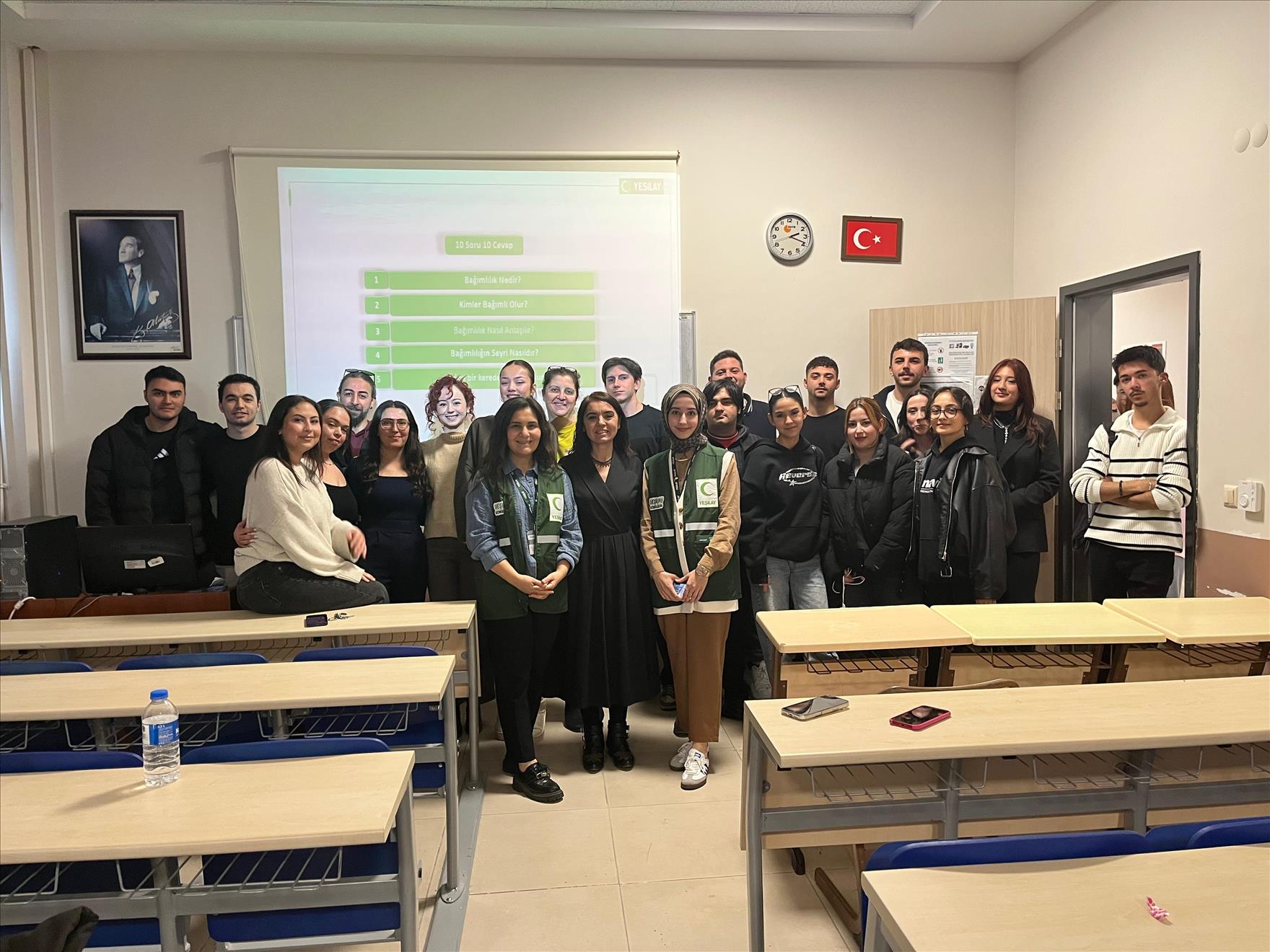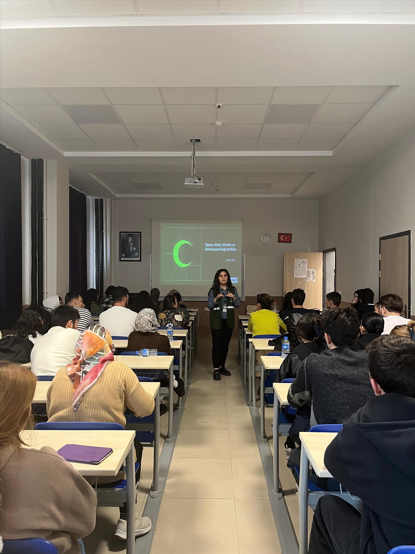 Yeşilay Danışmanlık Merkezi (YEDAM) uzmanlarından Psikolog Yeşim Başyaran ve Sosyal Hizmet Uzmanı Feyza Köklüsoy konuk olarak katıldığı etkinlikte bağımlılık ve bağımlılık türleri ele alınırken, özellikle madde bağımlılığı, teknoloji bağımlılığı, davranışsal bağımlılıklar ve gençlerin risk altında olduğu alanlar üzerinde duruldu. Uzmanlar, bağımlılıkla mücadelede erken farkındalığın önemine değinerek YEDAM’ın ücretsiz psikososyal destek hizmetleri hakkında öğrencilere bilgi verdi.