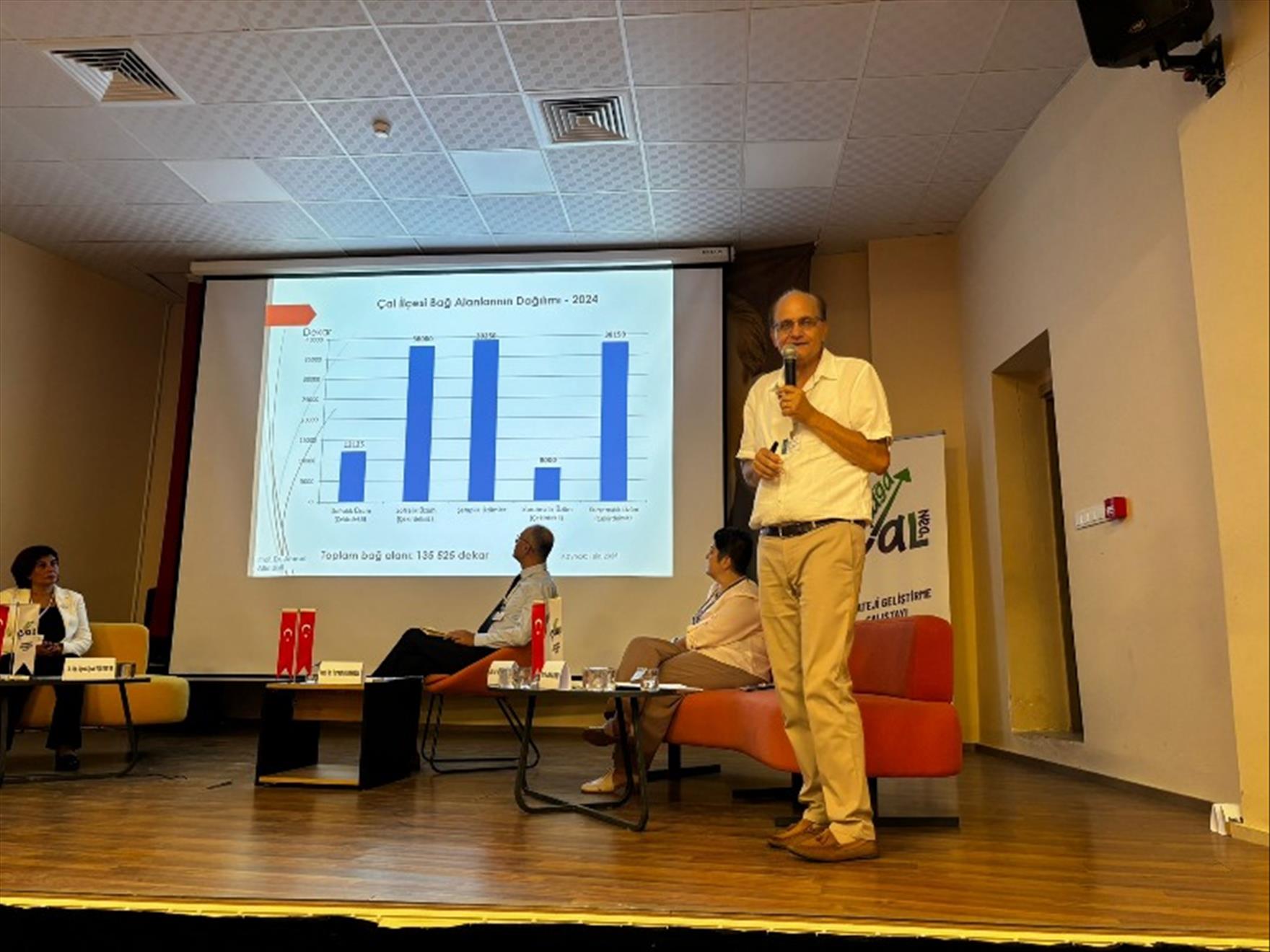 In the second session of the workshop titled “Viticulture Products,” moderation was carried out by Prof. Dr. Ahmet Altındişli. Prof. Dr. Turgut Cabaroğlu from Çukurova University Department of Food Engineering presented “Çal District’s Potential in Wine Production and Production Challenges,” stating that Çal is the capital of wine grape production, that the climate and soil conditions allow for high-quality grapes, and that the district has the potential to compete with world countries with its local grape varieties. He noted that wines from the region have won awards in international competitions, that they are conducting studies in the region, and that their TÜBİTAK project, accepted for funding, will work with the Çalkarası grape variety.