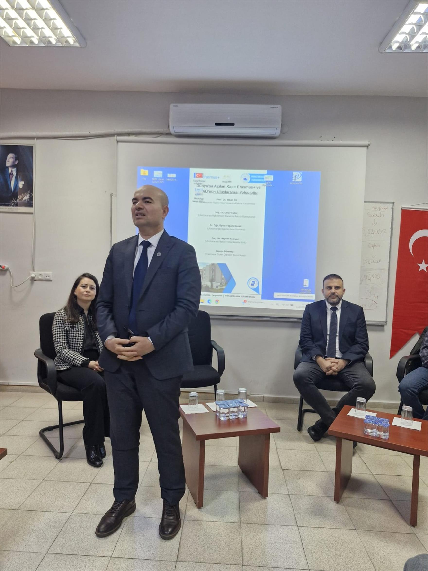 Honaz Meslek Yüksekokulundaki öğrenciler, akademik ve idari personelin Erasmus+ fırsatları hakkında bilgilendirilmesi ve uluslararası hareketliliğinin artırılmasının hedeflendiği seminer öğrenciler ve akademik, idari personel için 2 ayrı oturum şeklinde yapıldı. Öğrencilere yönelik oturumda, Giden Öğrenci Staj Hareketliliği Sorumlusu Gonca Dönmez, başvuru süreçleri, hibe olanakları, yurtdışı deneyiminin öğrencilerin sosyal ve kültürel yaşamına katkısı hakkında bilgiler verdi. İkinci oturumda Uluslararası İlişkilerden Sorumlu Rektör Danışmanı Doç. Dr. Onur Kulaç ve Uluslararası İlişkiler Koordinatörü Dr. Öğr. Üyesi Yaşam Demir, akademik ve idari personelin Erasmus+ kapsamında eğitim alma ve eğitim verme hareketliliği programlarını anlatarak soruları yanıtladı.