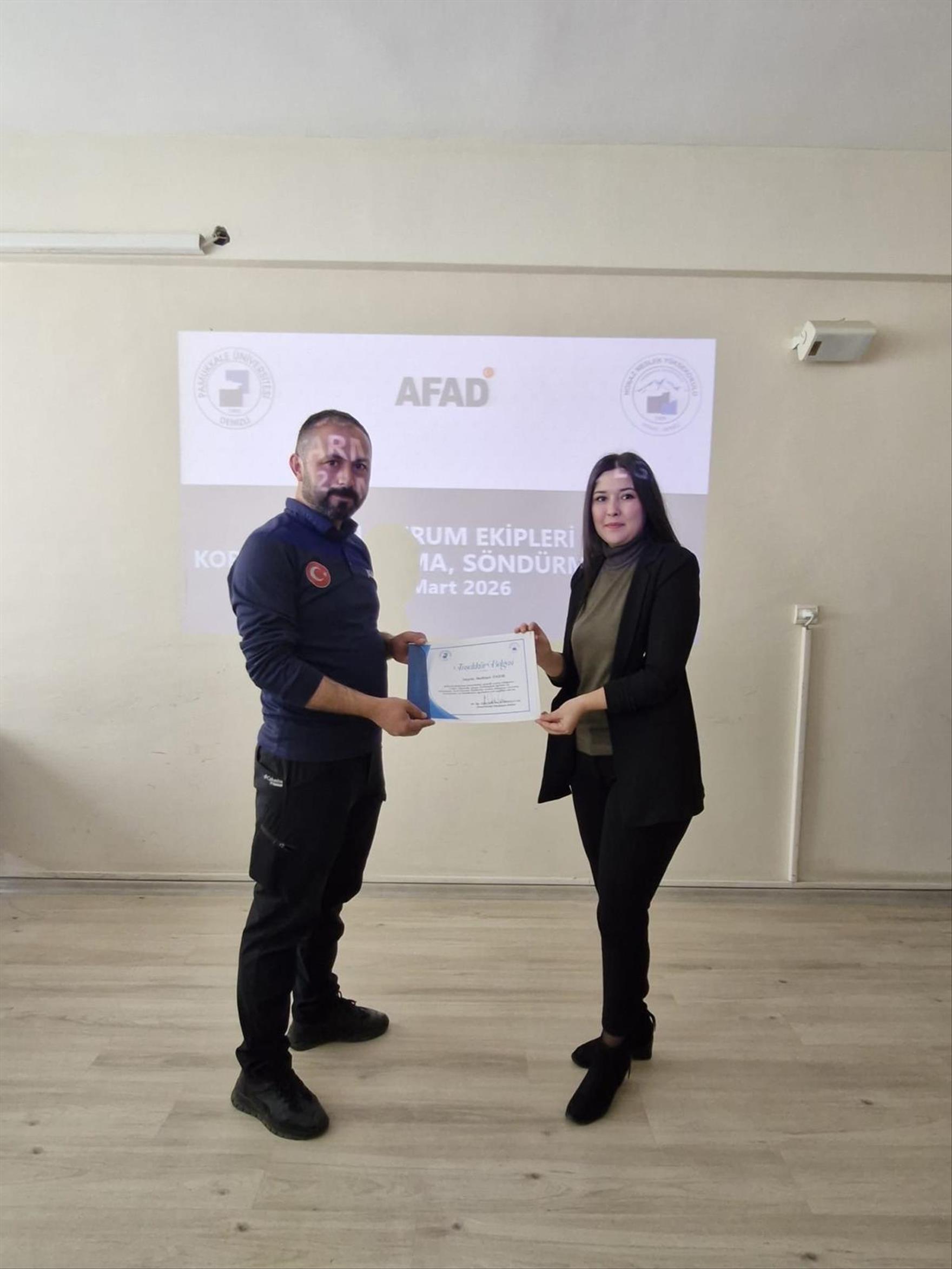 Honaz Meslek Yüksek Okulu Müdürü Dr. Öğretim Üyesi Necla İrem İri, afetlere karşı bireysel ve kurumsal hazırlığın öneminin vurgulandığı eğitimin çok verimli geçtiğini belirterek AFAD yetkililerine teşekkür belgelerini takdim etti.