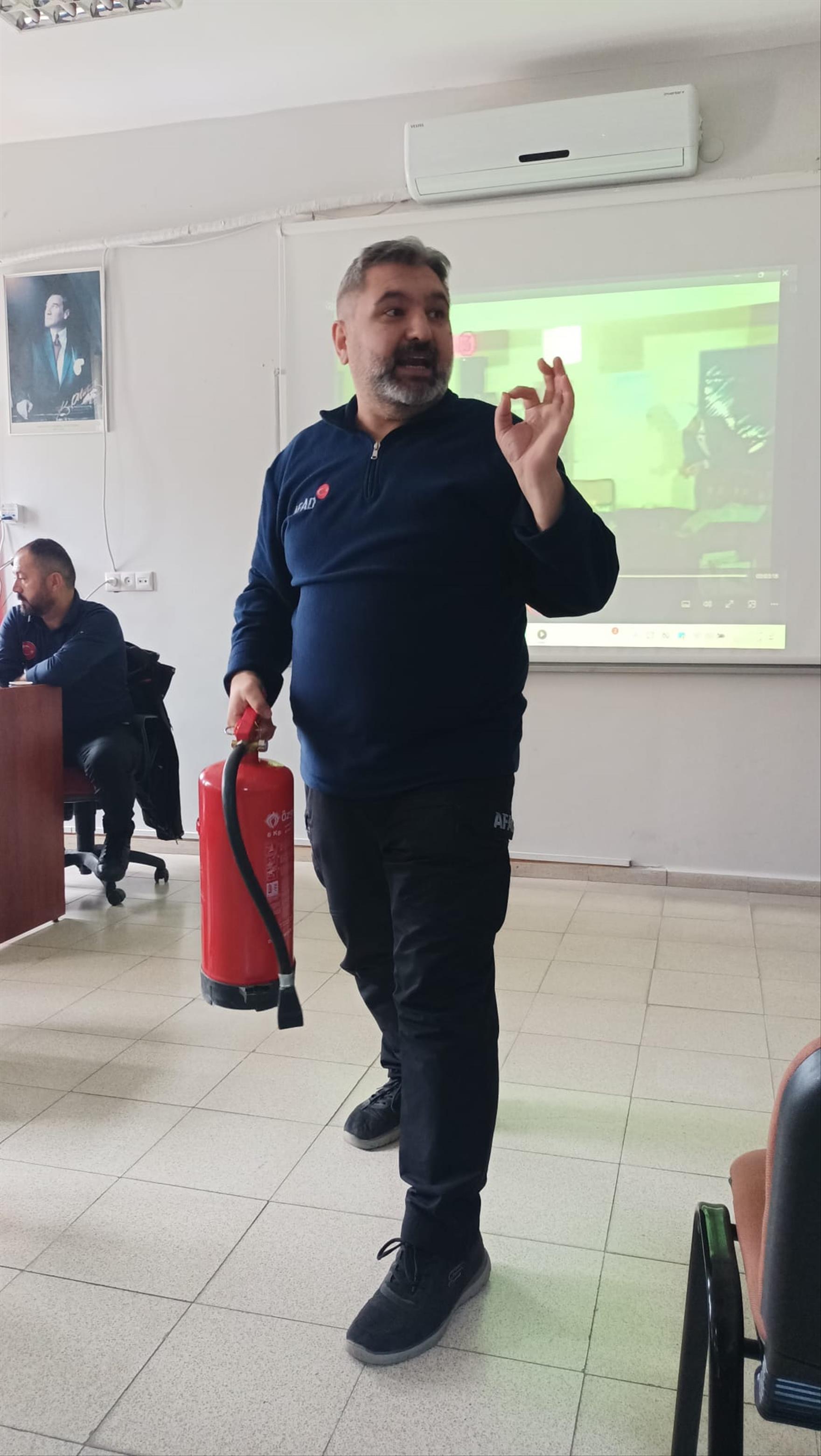 6331 sayılı İş Sağlığı ve Güvenliği Kanunu kapsamında çalışanlara acil durumlara yönelik bilgilendirme yapılmış, yılda en az bir kez zorunlu olan tatbikat gerçekleştirildi. Teorik eğitimin ardından okul bahçesinde düzenlenen yangın tatbikatına katılan akademik ve idari personel, yangın söndürme tüplerinin kullanımını uygulamalı olarak da deneyimleme imkânı buldu.