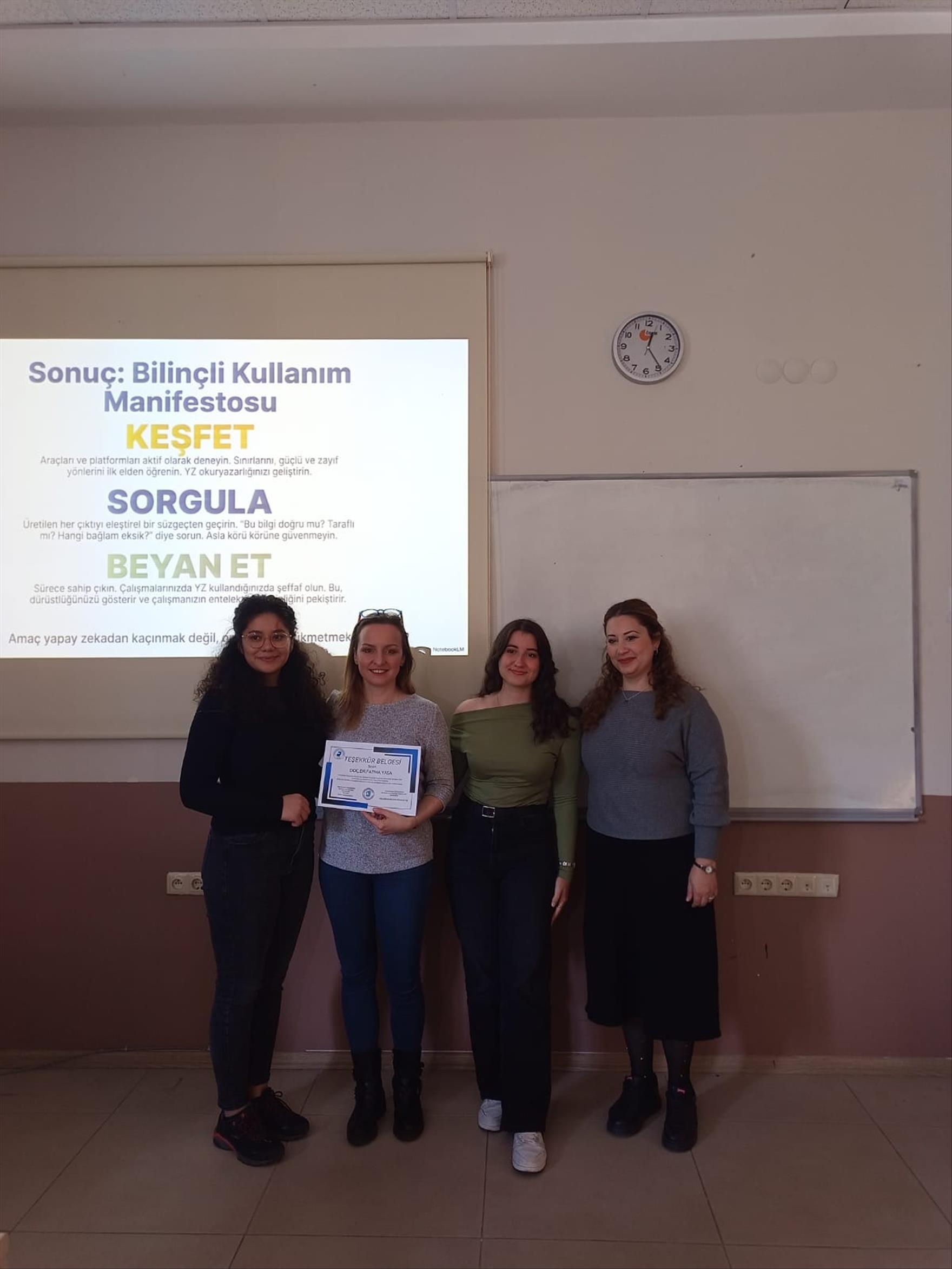 Doç. Dr. Fatma Yasa yapay zekâdan fikir alma konusunda, anlaşılmayan karmaşık gelen kavramları öğrenme konusunda ve ilham alıp esinlenme noktasında faydalanılabileceğini ancak bilgilerin tümden kopyalanmaması gerektiğini belirtti. Diğer taraftan keşfedilmesinden, sınırlarının öğrenilmesinden, güçlü ve zayıf yönlerinin araştırılmasından korkulmaması gerektiğini vurguladı. Atölye çalışması toplu fotoğraf çekiminin ardından sona erdi.