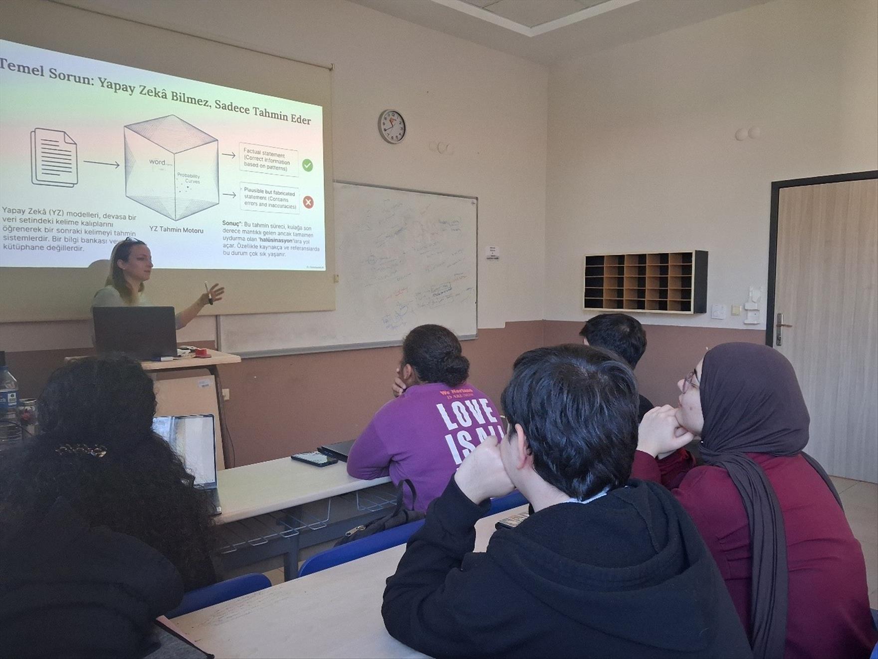 PAÜ İletişim Fakültesi’nde 12 Aralık Cuma günü İletişim ve Etkileşim Topluluğu iş birliği ile gerçekleşen atölye Yeni Medya ve İletişim Bölümü Öğretim Üyesi Doç. Dr. Fatma Yasa tarafından yapıldı. Çok sayıda öğrencinin katılım sağladığı atölye çalışmasında yapay zekâ kullanarak ödev ve araştırmaların nasıl doğru ve etkili yapılacağı, akademik çalışmalarda öğrencilerin faydalanabilecekleri doğru yapay zekâ arama robotları ve yazı özetleme platformları konusunda eğitim verildi.