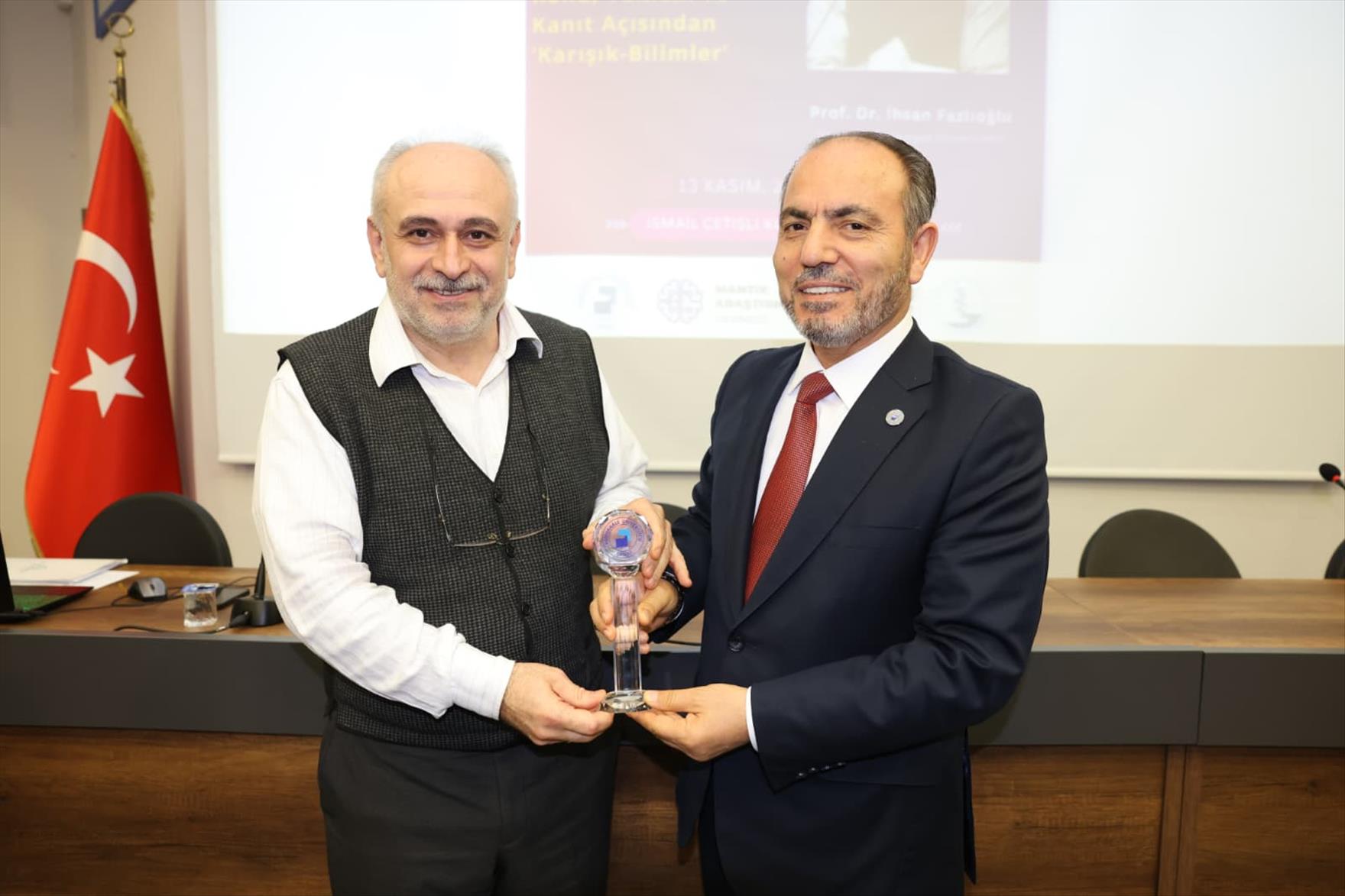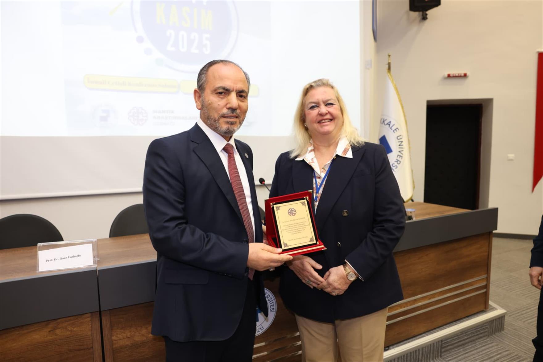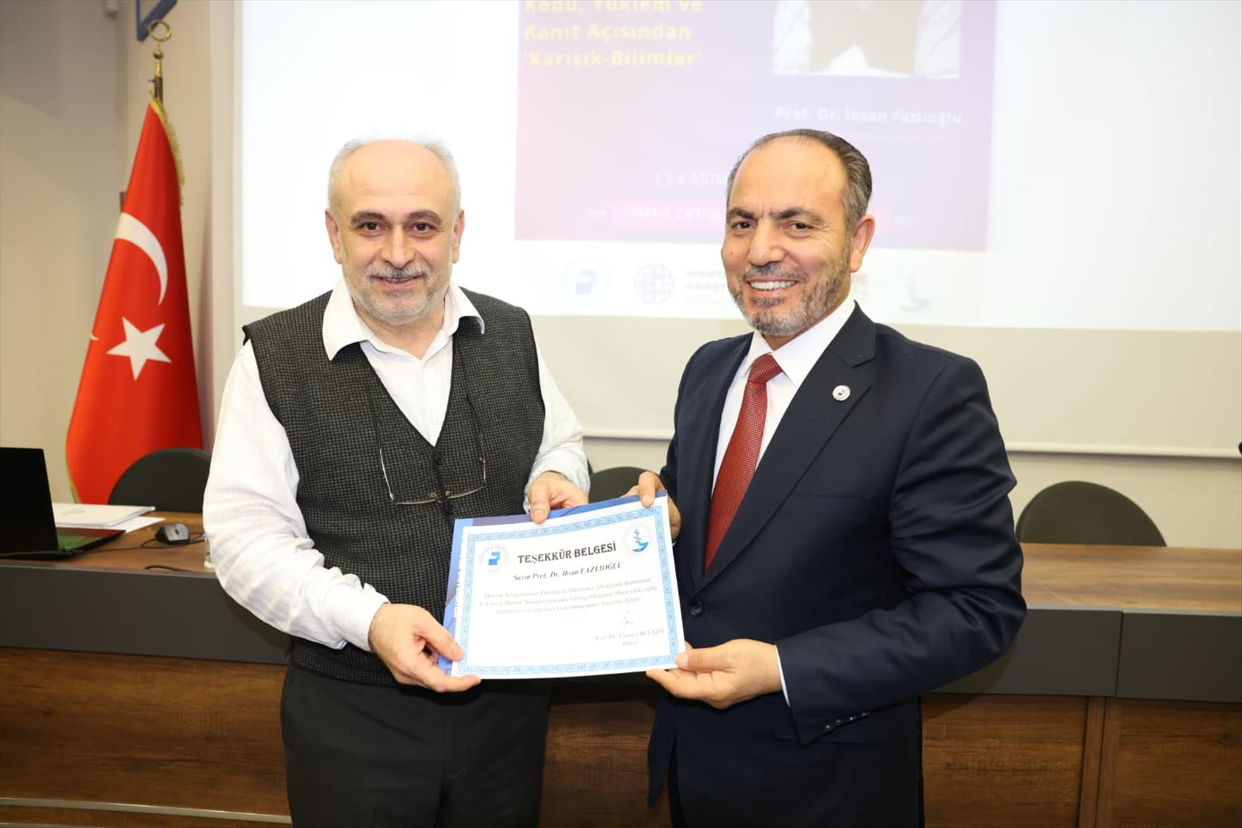 Konuşmasının sonunda Prof. Dr. İhsan Fazlıoğlu’na katkı ve katılımlarından dolayı Rektör Prof. Dr. Mahmud Güngör teşekkür belgesi ve şilt takdiminde bulundu. Rektör Prof. Dr. Güngör ayrıca sempozyumun düzenlenmesinde iş birliği yapılan Mantık Araştırmaları Derneği Başkanı Prof. Dr. Mahbube Nazlı İnönü ile Derneğin Başkan Yardımcısı Prof. Dr. Bülent Özkan’a teşekkür belgelerini ve şilt takdim etti.