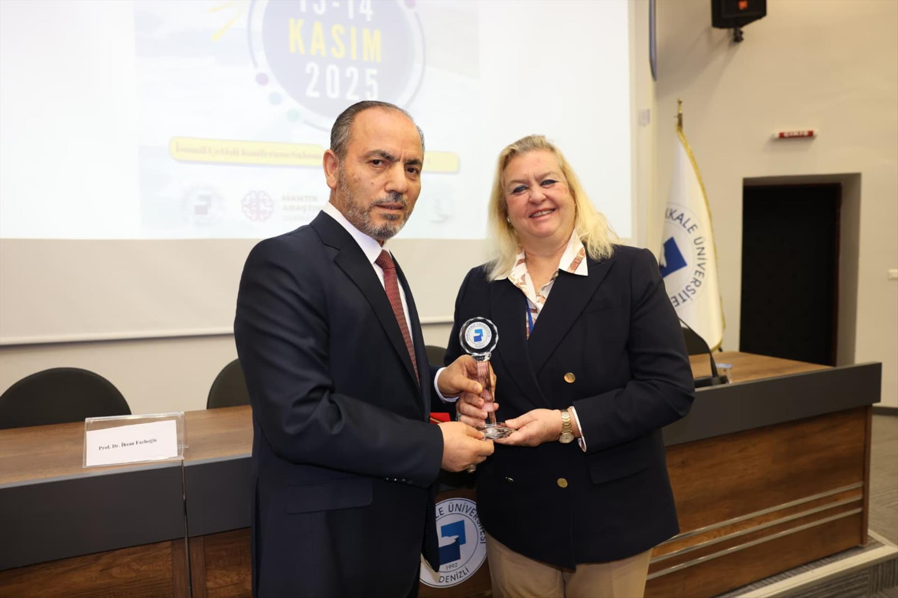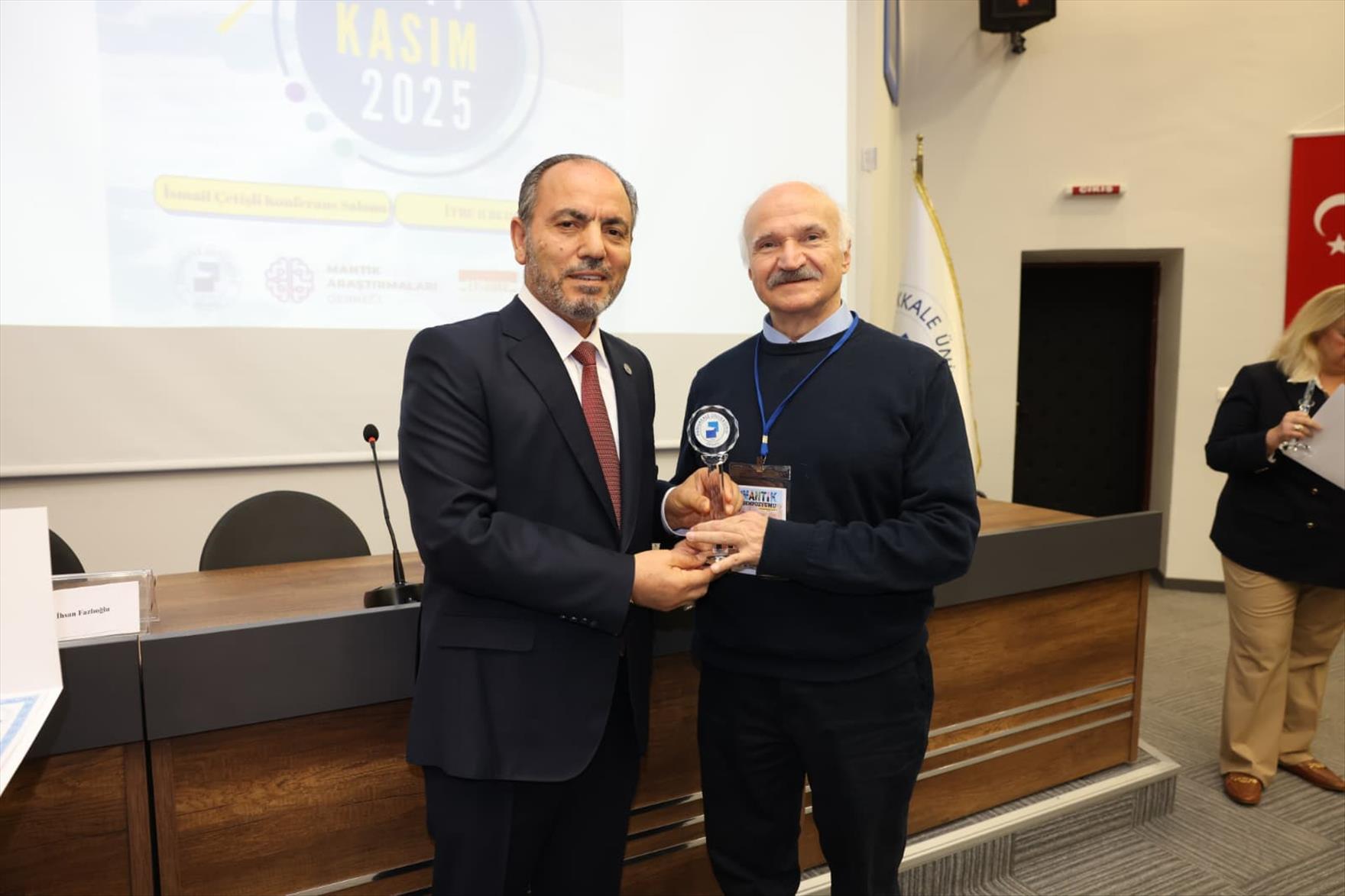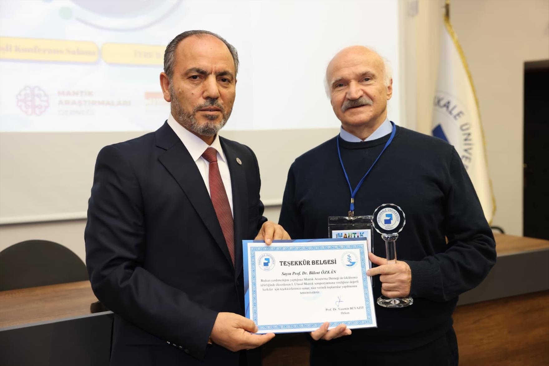 Konuşmasının sonunda Prof. Dr. İhsan Fazlıoğlu’na katkı ve katılımlarından dolayı Rektör Prof. Dr. Mahmud Güngör teşekkür belgesi ve şilt takdiminde bulundu. Rektör Prof. Dr. Güngör ayrıca sempozyumun düzenlenmesinde iş birliği yapılan Mantık Araştırmaları Derneği Başkanı Prof. Dr. Mahbube Nazlı İnönü ile Derneğin Başkan Yardımcısı Prof. Dr. Bülent Özkan’a teşekkür belgelerini ve şilt takdim etti.