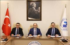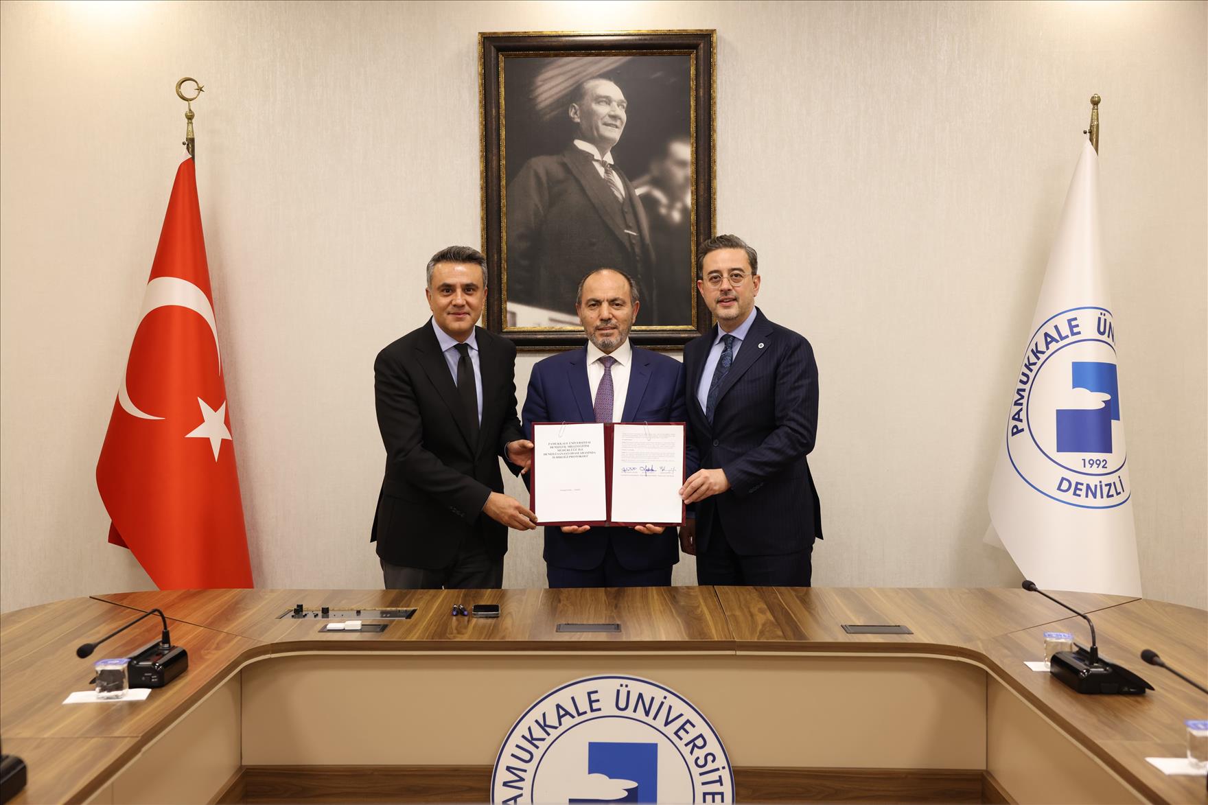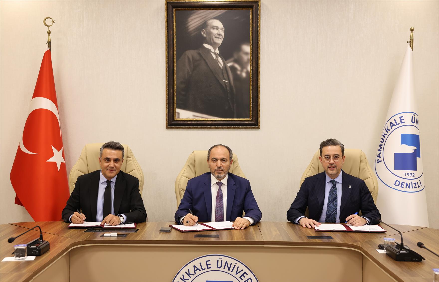 Pamukkale Üniversitesi (PAÜ) Rektörü Prof. Dr. Mahmud Güngör, Denizli İl Millî Eğitim Müdürü Dr. Emre Çalışkan ve Denizli Sanayi Odası (DSO) Başkanı Selim Kasapoğlu üç kurum arasında gerçekleştirilen iş birliği protokolüne imza attı.