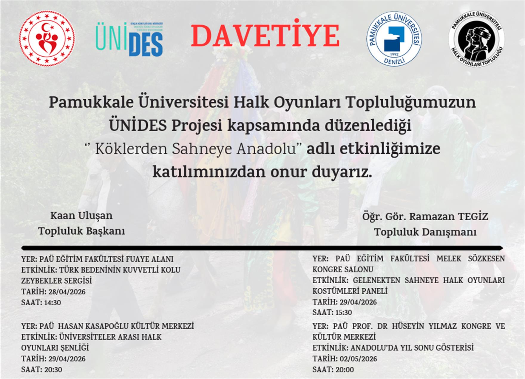 Pamukkale Üniversitesi (PAÜ) Eğitim Fakültesi öğretim elemanı Öğr. Gör. Ramazan Tegiz’in danışmanlığında Pamukkale Üniversitesi Halk Oyunları Topluluğu ÜNİDES Projesi kapsamında düzenlediği “Köklerden Sahneye Anadolu” adlı etkinlik ile izleyicilerle buluşuyor.