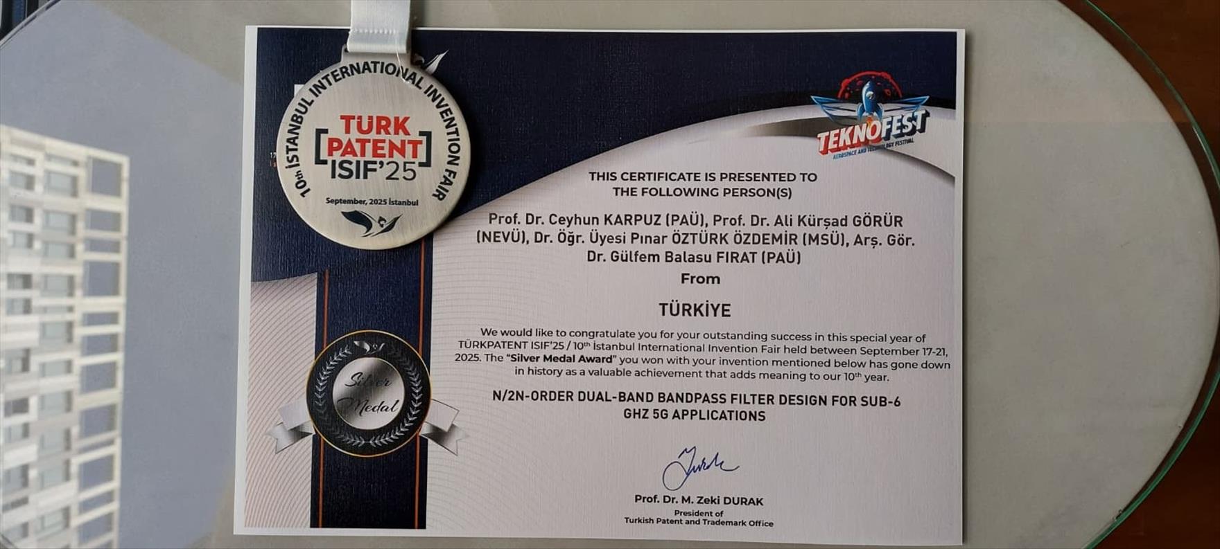One of the silver medals was awarded to the invention titled “Design of N./2N. Order Two-Band Bandpass Filter for Sub-6 GHz 5G Applications,” developed by inventors from Pamukkale University, National Defense University, and Nevşehir Hacı Bektaş Veli University, including Prof. Dr. Ceyhun Karpuz (PAU), Res. Asst. Dr. Gülfem Balasu Fırat, Prof. Dr. Ali Kürşad Görür (NEVU), and Dr. Öğr. Üyesi Pınar Öztürk Özdemir (MSU).