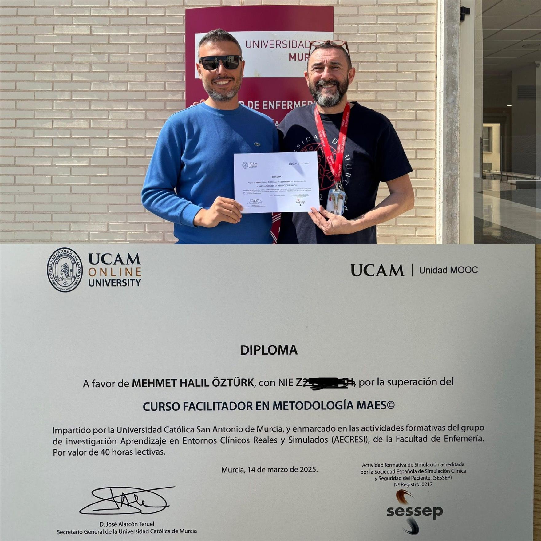Sağlık eğitiminde çıtayı yükselten Pamukkale Üniversitesi, bünyesinde bir ilk olma özelliği taşıyan bu yeni metodoloji sayesinde, uluslararası standartlarda profesyoneller yetiştirme kararlılığını sürdürüyor. Bu kapsamda, PAÜ Denizli Sağlık Hizmetleri Meslek Yüksekokulu (DSHMYO), İlk ve Acil Yardım Programı öğretim elemanı Öğr. Gör. Dr. Mehmet Halil Öztürk İspanya Murcia Üniversitesi’nde yürüttüğü post-doktora çalışmaları kapsamında, sağlık eğitiminde dünya çapında kabul gören Simüle Ortamlarda Kendi Kendine Öğrenme Metodolojisi (MAES©) üzerine; metodolojinin geliştiricilerinden Prof. Dr. José Luis Díaz Agea ile çalışarak ilgili sertifikasyon sürecini başarıyla tamamlayarak sertifika almaya hak kazandı.