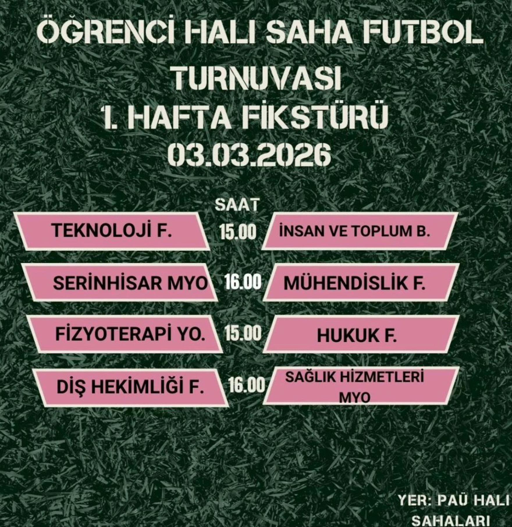 Pamukkale Üniversitesi (PAÜ) Sağlık Kültür ve Spor Daire Başkanlığı tarafından düzenlenen Öğrenci Halı Saha Futbol Turnuvası heyecanı Rektör Prof. Dr. Mahmud Güngör'ün başlama vuruşuyla start alacak.