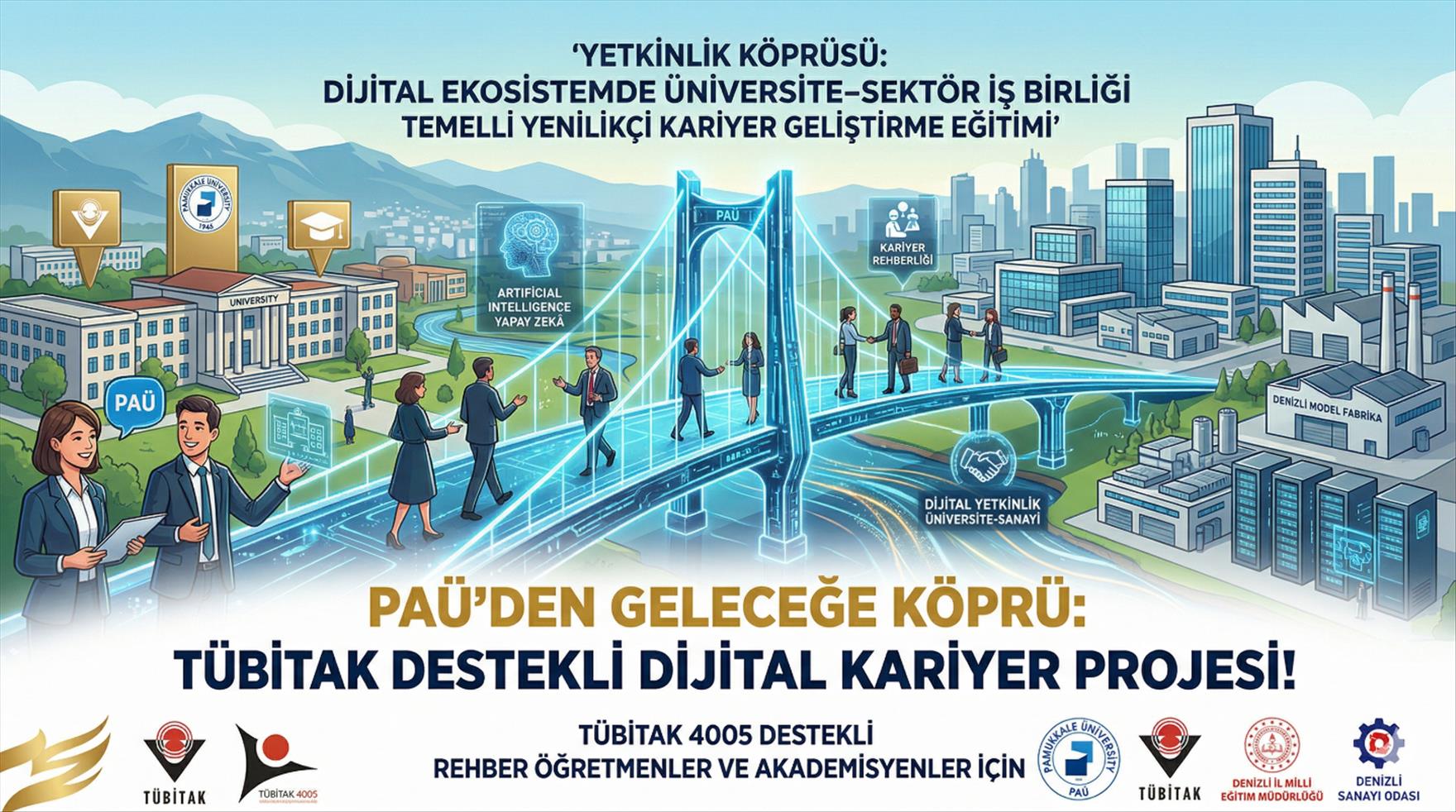 Pamukkale Üniversitesi Kariyer Planlama, Uygulama ve Araştırma Merkezi (PAÜ KARMER) koordinasyonunda hazırlanan “Yetkinlik Köprüsü: Dijital Ekosistemde Üniversite–Sektör İş Birliği Temelli Yenilikçi Kariyer Geliştirme Eğitimi” başlıklı proje, TÜBİTAK 4005 Yenilikçi Eğitim Uygulamaları Destekleme Programı kapsamında kabul edildi. Türkiye genelinde yapılan 260 başvuru arasından seçilerek büyük bir başarıya imza atan proje; PAÜ Kariyer Planlama, Uygulama ve Araştırma Merkezi Müdürü Dr. Öğr. Üyesi Bilal Göde’nin yürütücülüğünde, Denizli İl Millî Eğitim Müdürlüğü ve Denizli Sanayi Odası’nın güçlü iş birliğiyle hayata geçirilecek.