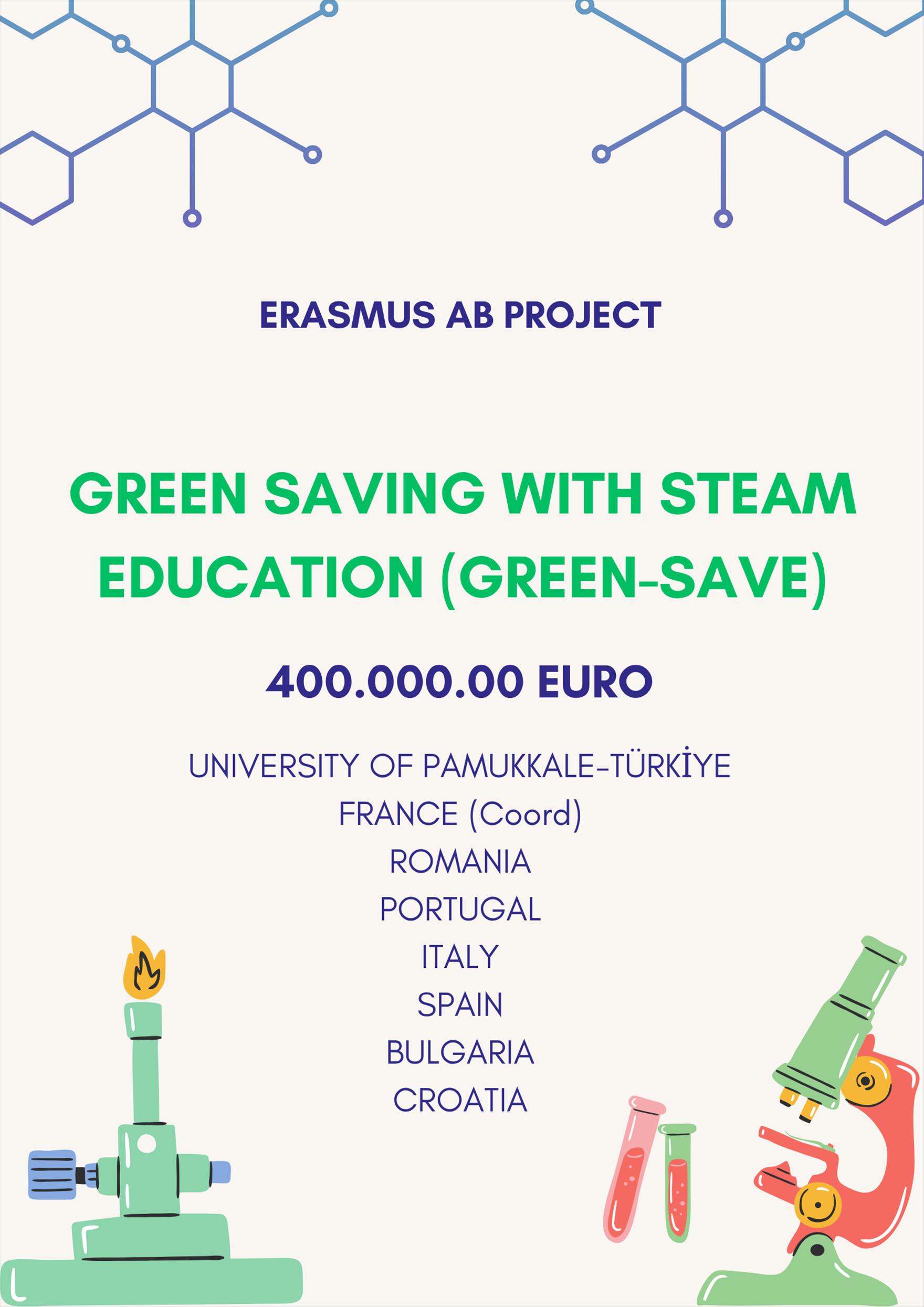 Pamukkale Üniversitesi’nin (PAÜ) ortağı olduğu Fransa, İtalya, İspanya, Portekiz, Romanya, Bulgaristan ve Hırvatistan yer aldığı “Green Saving with Steam Education (GREEN-SAVE)” başlıklı AB Erasmus projesi kabul edildi. Projenin PAÜ’nün uluslararası tanınırlığına katkı sağlayacağı ve farklı ülkelerle akademik iş birliklerini geliştireceği düşünülüyor.