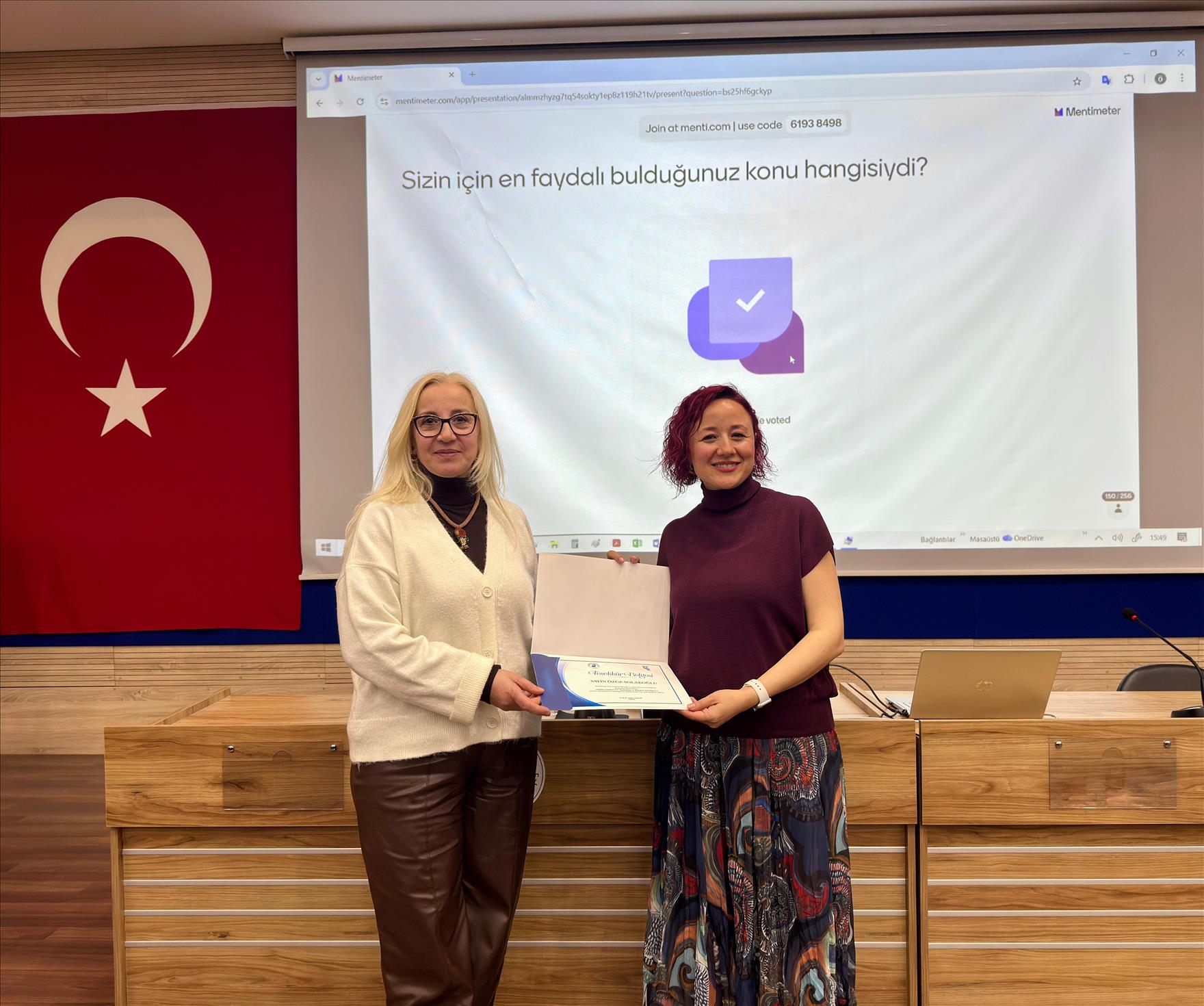 Sunumun ikinci bölümünde etkili bir özgeçmiş hazırlamanın temel ilkelerine geçen Solakoğlu, yetkinlik bazlı mülakat tekniklerini uygulamalı örneklerle açıkladı. İş dünyasına adım atmadan önce güçlü akademik ve mesleki referanslara sahip olmanın stratejik önemine dikkat çeken Solakoğlu, konuşmasını katılımcıların eş zamanlı yanıt verdiği interaktif bir çevrimiçi oylama uygulamasıyla tamamladı.