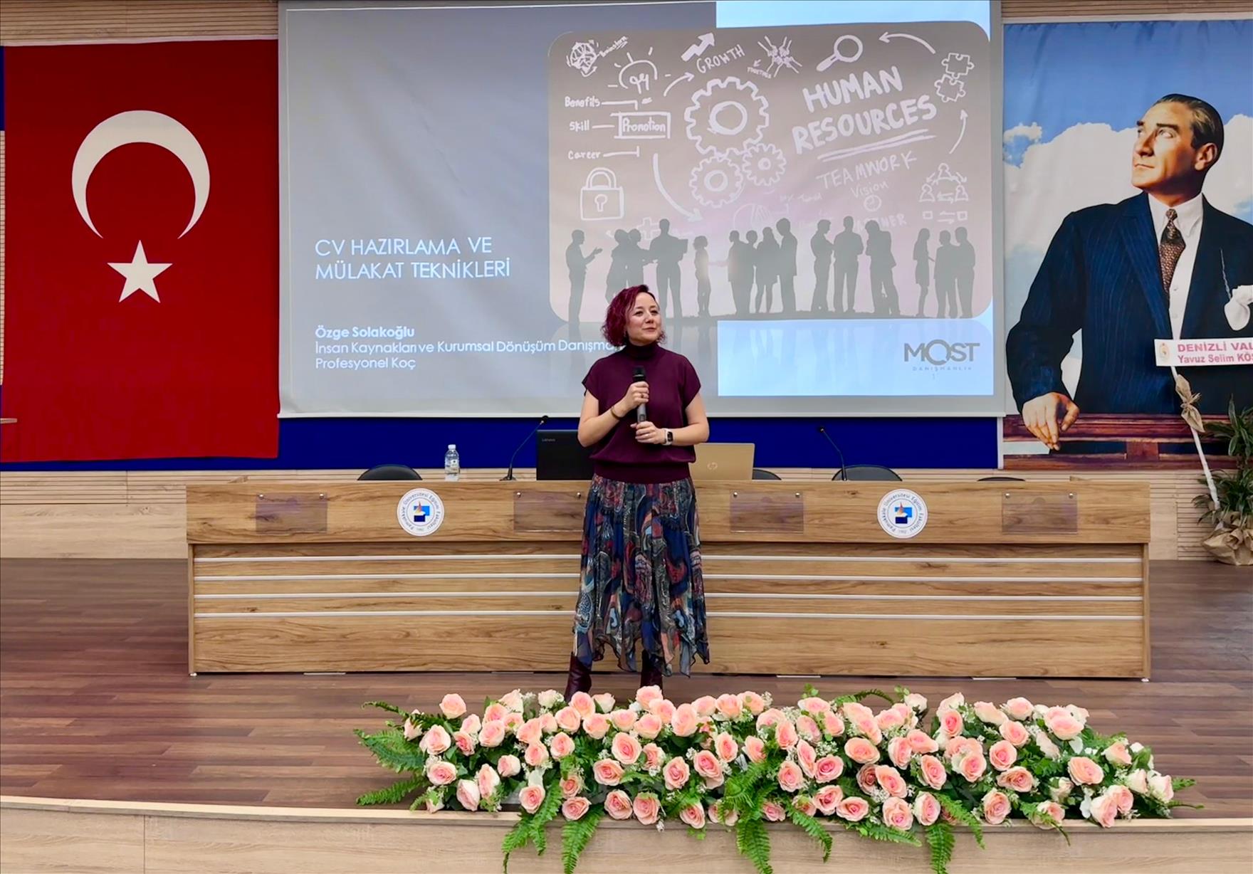Pamukkale Üniversitesi (PAÜ) İktisadi ve İdari Bilimler Fakültesi (İİBF) Sektör Günleri kapsamında İnsan Kaynakları Danışmanı Özge Solakoğlu’nun, “CV Hazırlama ve Mülakat Teknikleri” başlıklı konferansı öğrencilere iş hayatına hazırlık sürecinde pratik ve psikolojik rehberlik sundu.