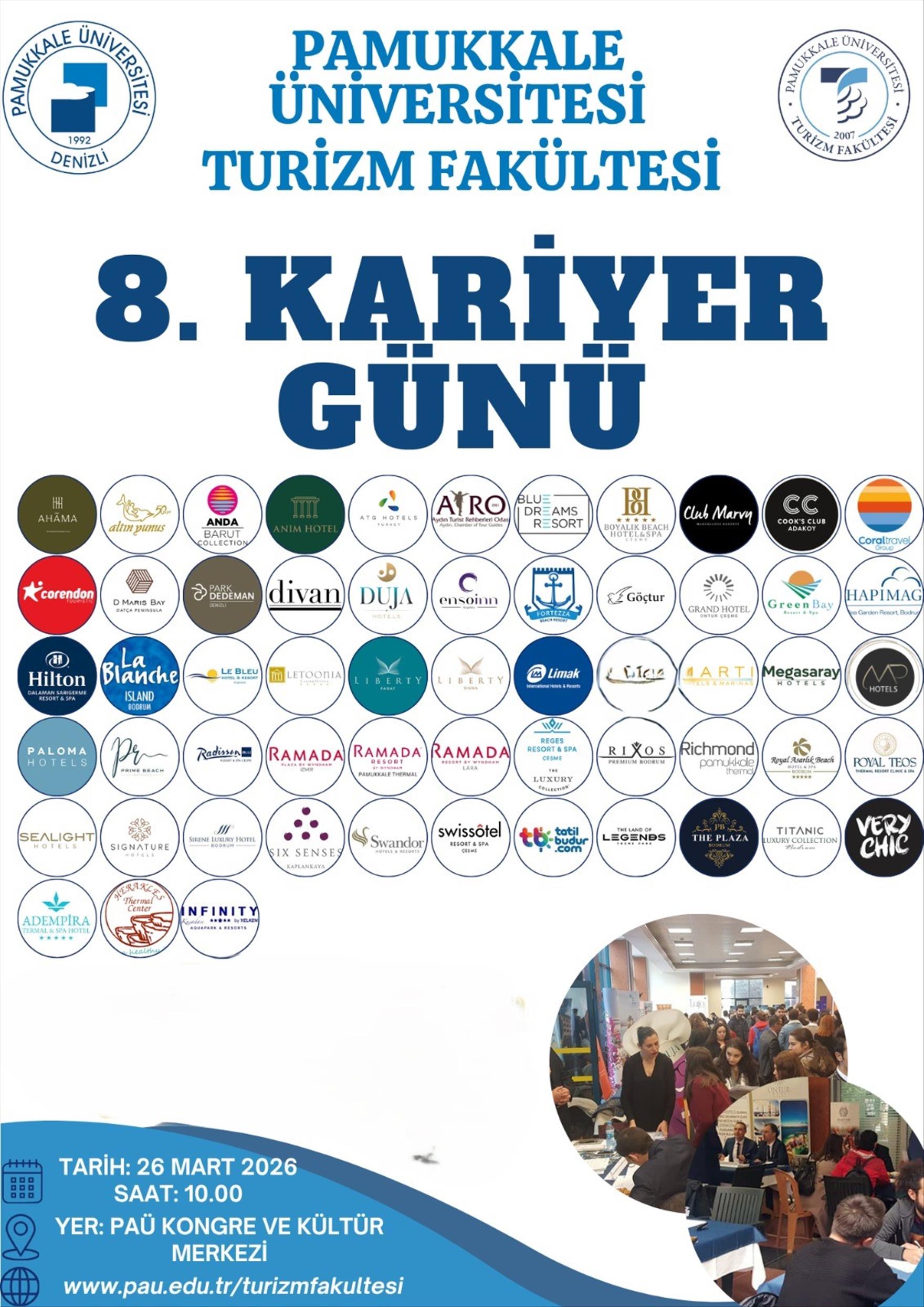 Pamukkale Üniversitesi (PAÜ) tarafından 26 Mart tarihinde düzenlenecek olan 8. Kariyer Günü kapsamında, ülkemizin önde gelen 50’den fazla turizm işletmesi PAÜ öğrencileriyle buluşacak.