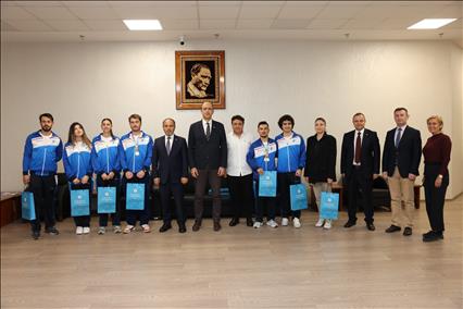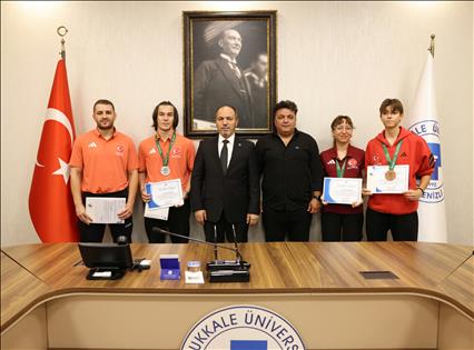 Pamukkale University (PAU) national swimmer Ahmet Mete Boylu, accompanied by his coach and PAU Faculty of Sport Sciences staff member Musa Özcan, paid a visit to Rector Prof. Dr. Mahmud Güngör at his office.