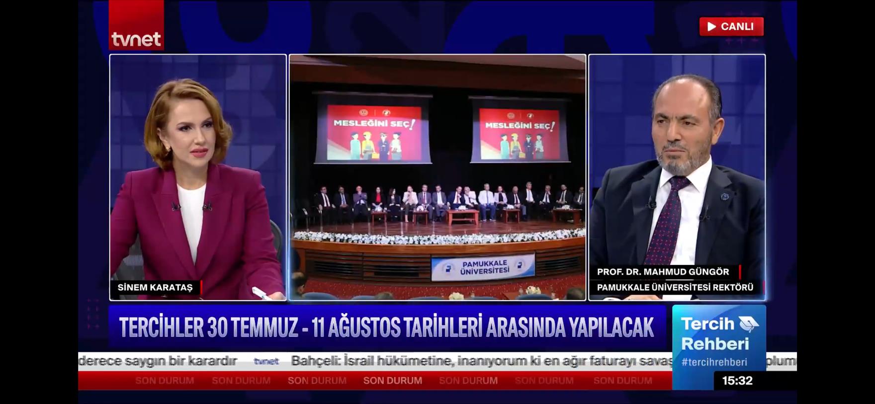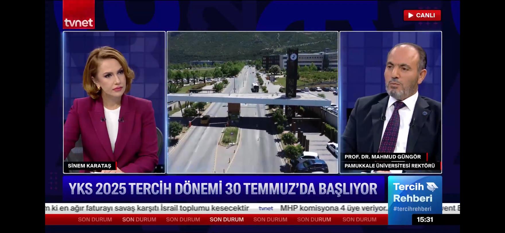 Pamukkale Üniversitesi (PAÜ) Rektörü Prof. Dr. Mahmud Güngör, Tvnet kanalında yayınlanan “Tercih Rehberi” programına konuk oldu. Programda üniversite adaylarına ve ailelerine önemli bilgiler aktaran Rektör Prof. Dr. Güngör PAÜ’nün sunduğu akademik ve sosyal imkânları, üniversite-sanayi iş birliklerini, uluslararasılaşma vizyonunu ve gençlere yönelik hedeflerini anlattı.